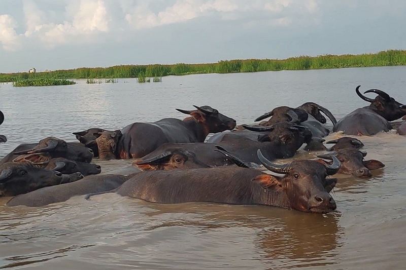We moeten best wel lang wachten en in de badende zon is het vreselijk warm. Na een tijdje zien we een aantal buffels in de verte tussen het groen steeds dichterbij komen, maar het duurt nog een flinke tijd voordat de dieren bij ons zijn. Het laatste deel naar de stal is het dieper water en moeten ze echt zwemmen, wat een uniek gezicht is.