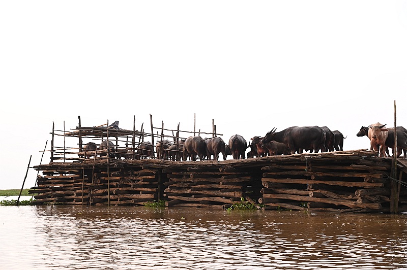 Het eerste deel van de tocht zitten we op het dak van een grotere boot tot we redelijk ver in het moeras zijn beland en we overstappen in een kleine, maar gemotoriseerde kano. Hiermee varen we naar de 'stallen', Dat zijn houten constructies waar de buffels, hoog en droog boven het water, de nacht door zullen brengen.