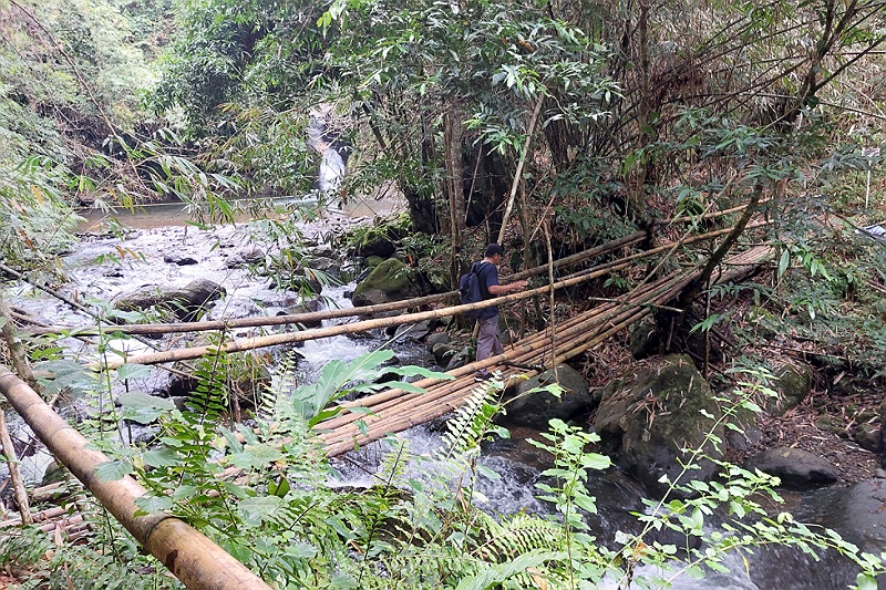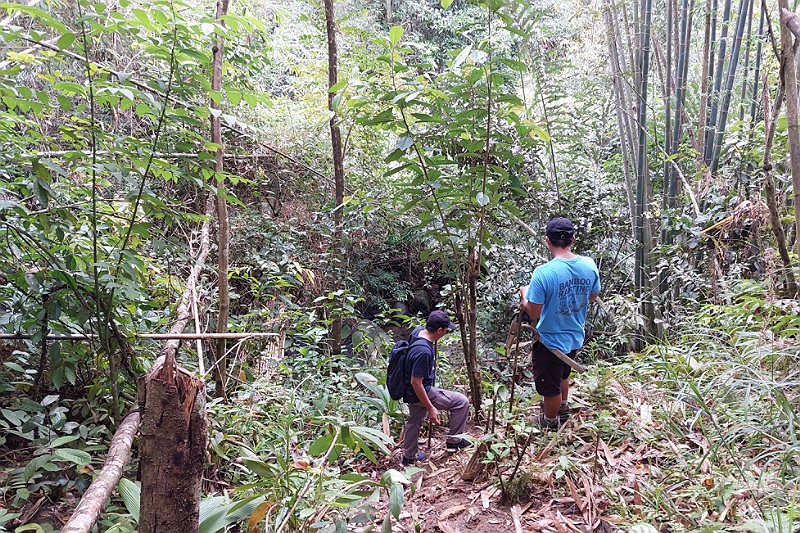 Gaat de trekking eerst nog over paadjes waar de plaatselijke bevolking ook gebruik van maakt, uiteindelijk gaat het over in jungle waar onze gids, de plaatselijke ranger, met een machette een pad voor ons moet maken. We beklimmen steile hellingen die we natuurlijk ook weer af moeten dalen, lopen over gammele bruggetjes van bamboe of planken en overal is het glad van de modder. Voor één helling rolt de ranger een lang lint met knopen uit waarlangs we af kunnen dalen.