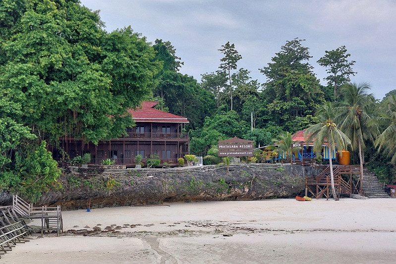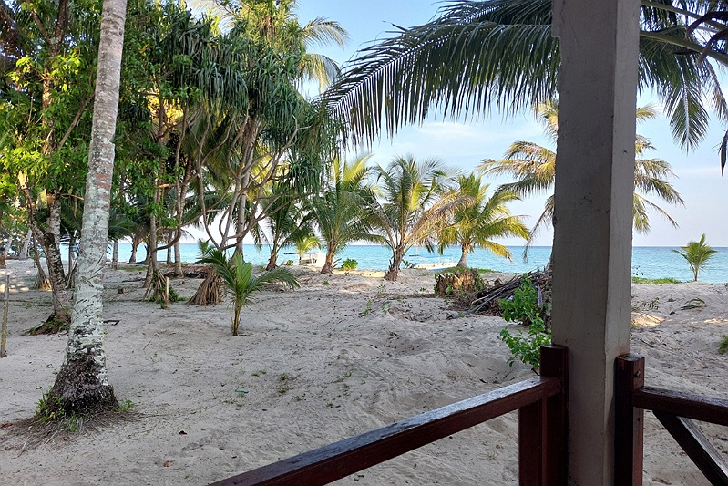 Na nog eens een kwartiertje varen zijn we dan eindelijk bij de Sangalaki lodge, de enige bebouwing op het hele eilandje. Het begint al goed met uit de boot stappen en door het water het laatste stukje naar de wal lopen. Ook hier staat iemand met een drankje en een koel doekje ons op te wachten. We gaan vervolgens eerst naar onze kamer, een leuke cabin met comfortabele bedden en een warme douche. Het schijnt dat we zelfs vierentwintig uur per dag elektra hebben. Onze koffers worden gelukkig door de bemanning van de boot naar ons huisje gebracht. De weg daar naar toe is allemaal strand.