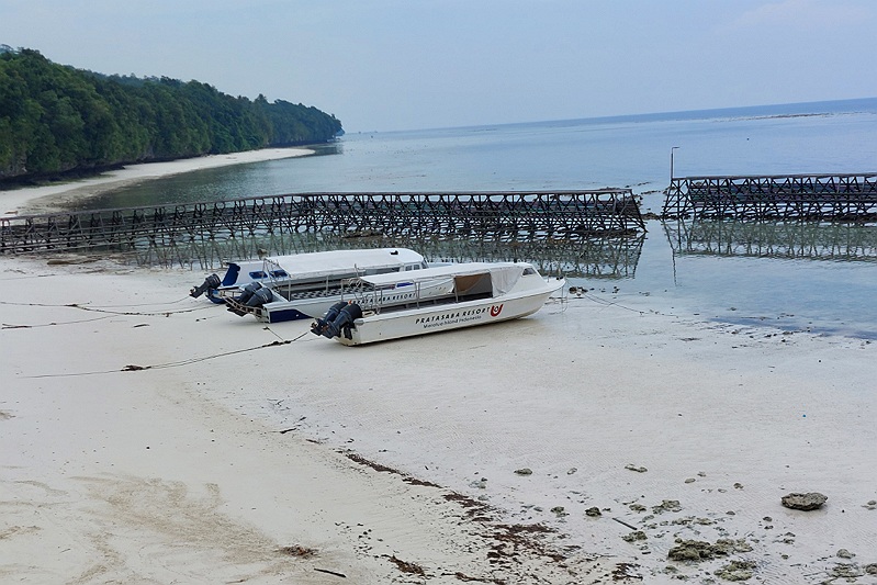 De boten van het resort liggen bij laag water op het zand.