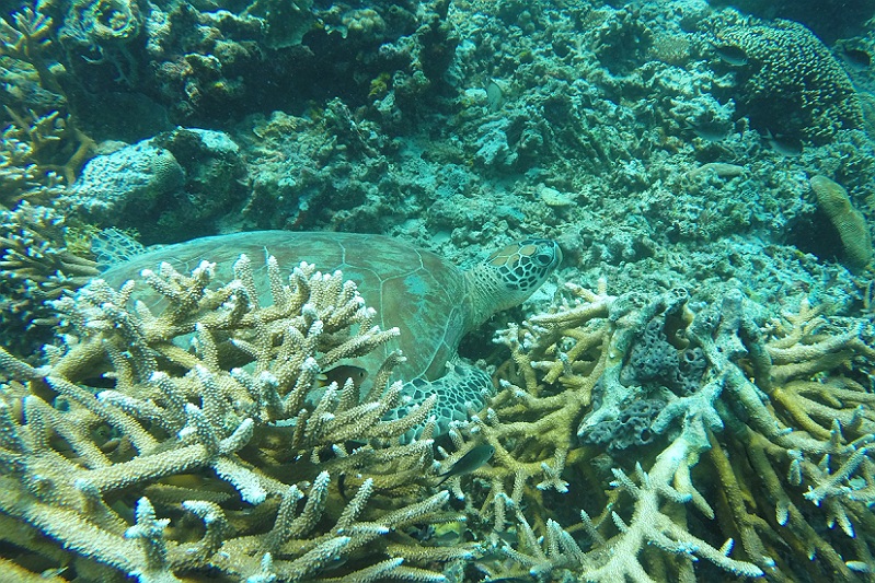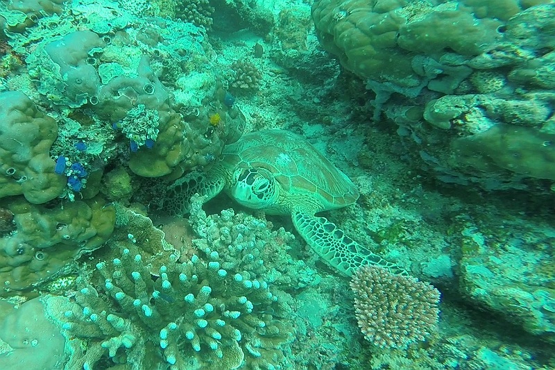 Wat een geweldige plek om rond te zwemmen. Niet alleen voor het mooie koraal en de vele tropische vissen en visjes, maar vooral voor de vele schildpadden. Het is niet diep en je zwemt eigenlijk vlak boven de bodem waar heel veel schildpadden op zoek zijn naar voedsel. Af en toe zwemt er eentje vlak langs je om aan de oppervlakte even een hap adem te gaan halen.