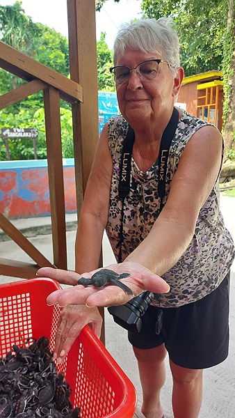 Vervolgens komt Rickey weer met een emmer met zo'n tweehonderd jonge schildpadjes aanzetten die de vrijheid krijgen. Ans en ik hebben het gisteren al gezien, maar voor Mathi en Jeroen is het de eerste keer. Maar we genieten er allemaal van. Zo aandoenlijk om die kleintjes naar het water te zien rennen terwijl de vele jonkies die de verkeerde kant op lopen door ons met het koppie in de goede richting gezet moeten worden. Toch is het gauw voorbij. Een paar minuten later al zien we een laatste verdwaalde baby het water inlopen en verdwijnen in de kleine golven.