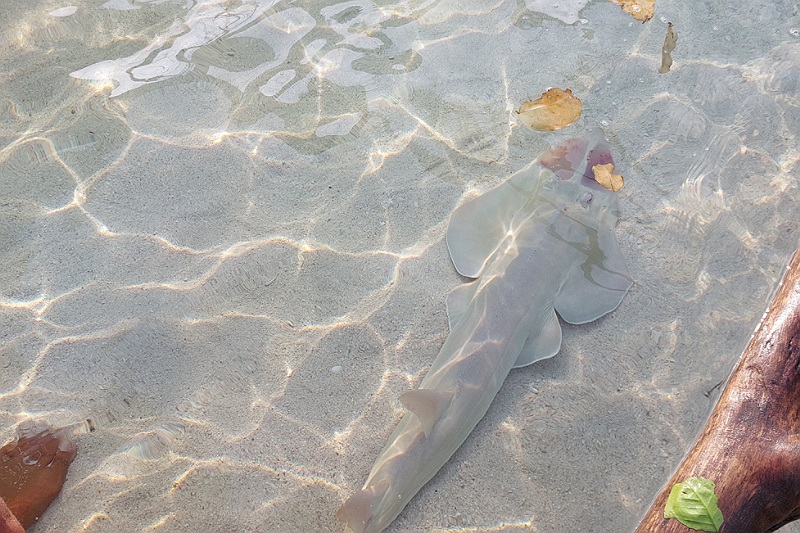 Bij een kort stukje waden door het water ligt er ineens een jonge haai van zo'n tachtig cm voor onze voeten. Even later lopen we langs de kant van het water en zien we slechts twee meter van ons vandaan een stingray in het water en niet veel later een giftige kogelvis. Nu begrijp ik ook zijn bezorgdheid toen Ans en ik het water opzochten om te zwemmen.