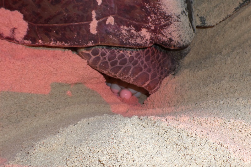 Mathi en Jeroen zitten al op de knietjes naast een enorm grote schildpad die eieren in een kuil aan het leggen is. Je ziet de stapel eieren steeds groter worden. Eenmaal het laatste ei gelegd begint het dier meteen de kuil weer dicht te gooien. Het blijft een geweldig mooi gezicht.
