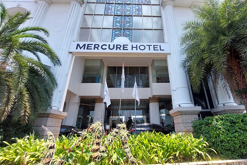 De entree van het grote en luxe Mercure hotel.